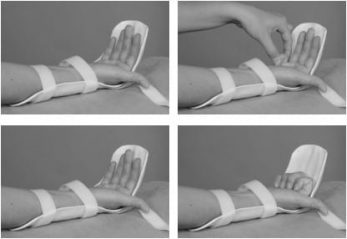 • ورزش (1): با استفاده از دست سالم خود، انگشت دست مصدوم خود را به آرامی به سمت چین‌های کف دست خود خم کرده و آن‌ها را 3-5 ثانیه نگه دارید. به آرامی اجازه دهید انگشتان با حالت اولیه بازگردند و انگشت خود را بدون کمک گرفتن از دست سالم خود به حالت اسپلینت صاف کنید.